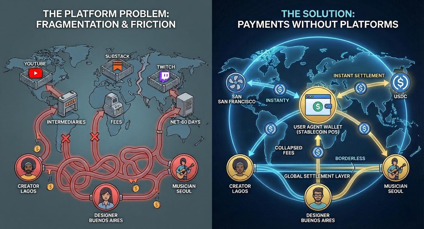 If that developer in Lagos wants to get paid by a fan in San Francisco, they hit a wall of intermediaries. Twitch takes 50%. The local bank takes a wire fee. The currency exchange eats 3%. And the settlement takes Net-60 days.